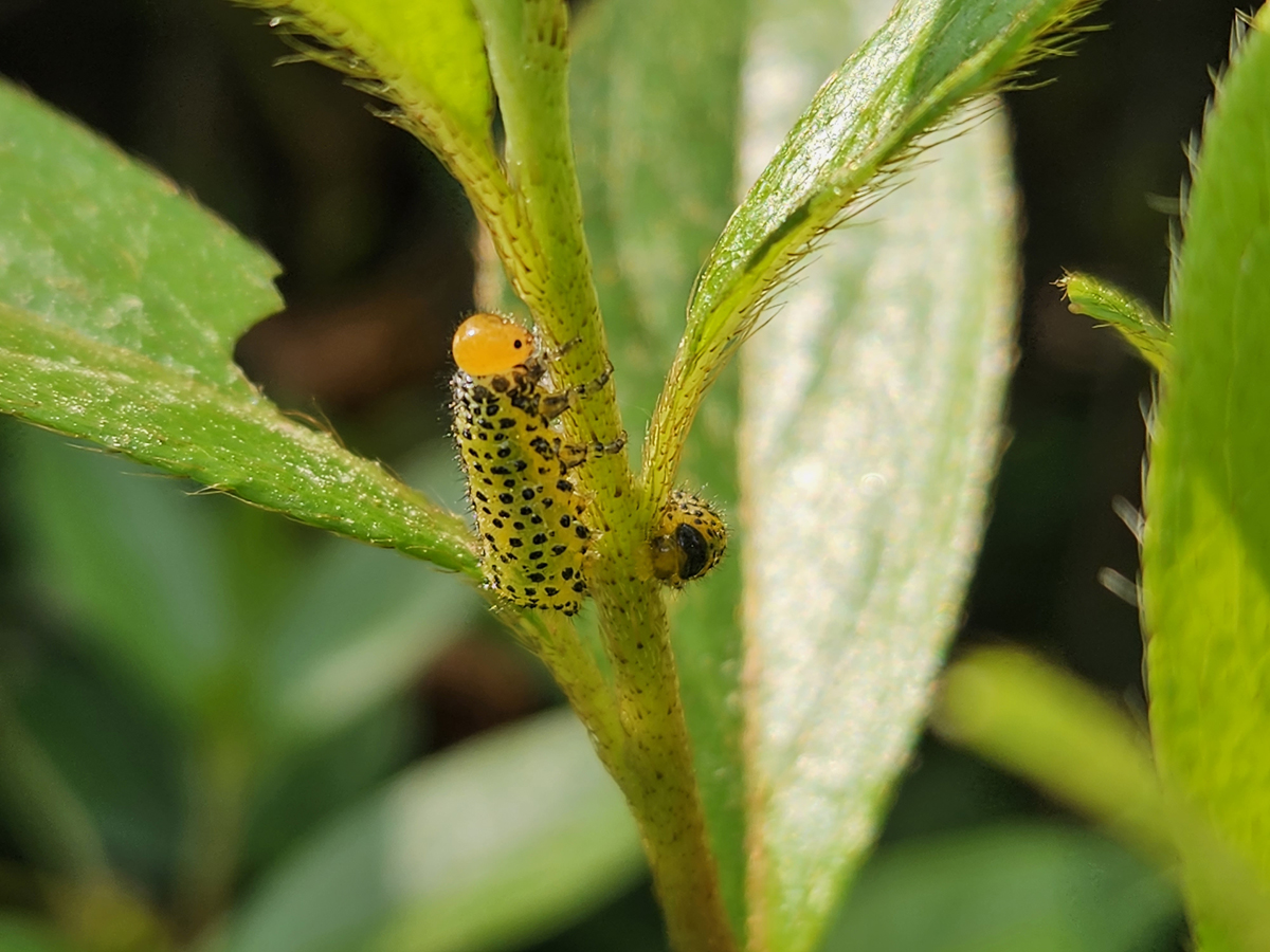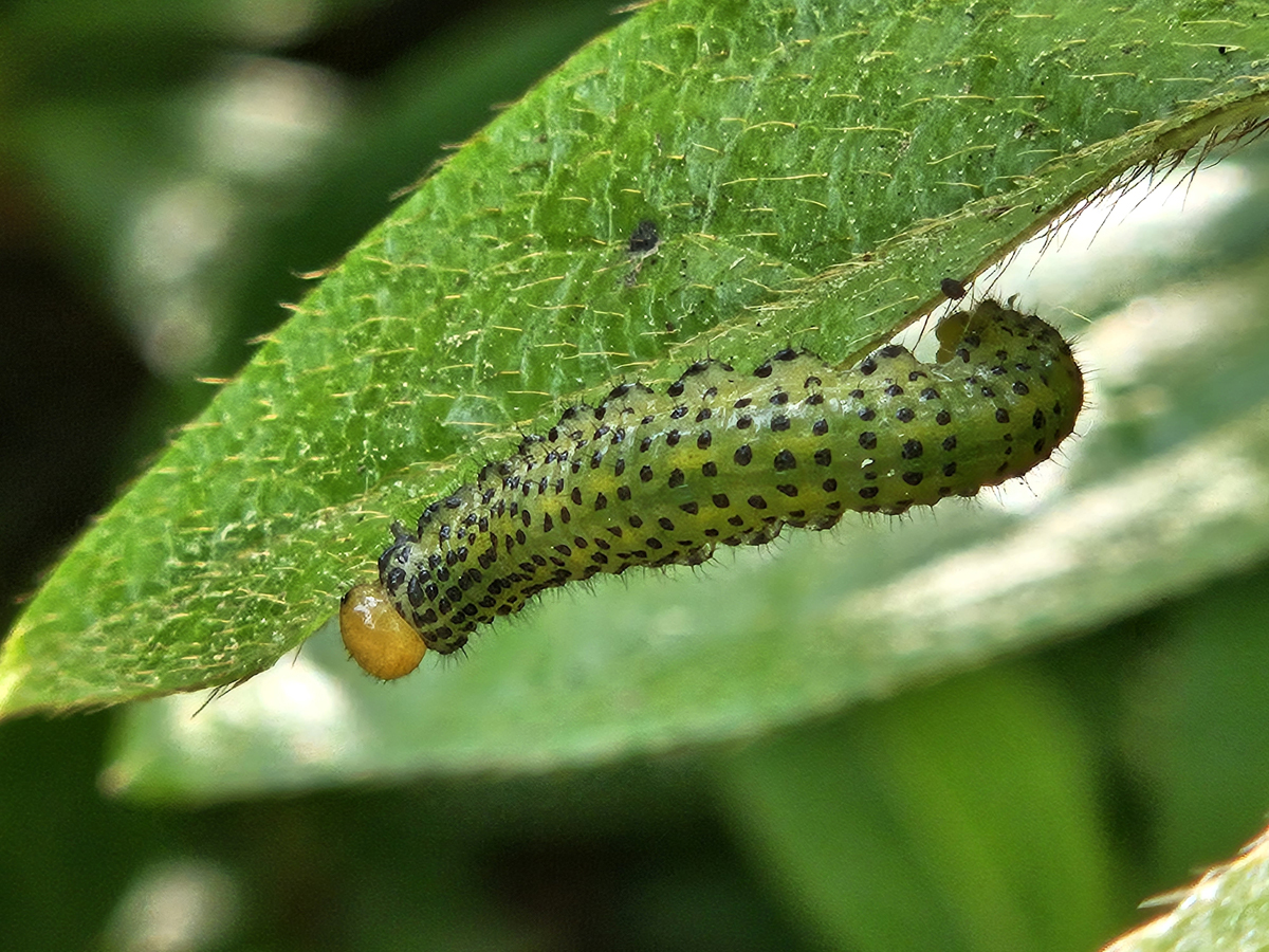 유충의 몸길이는 20mm 정도이고 황록색이며 검은색 무늬가 있다.