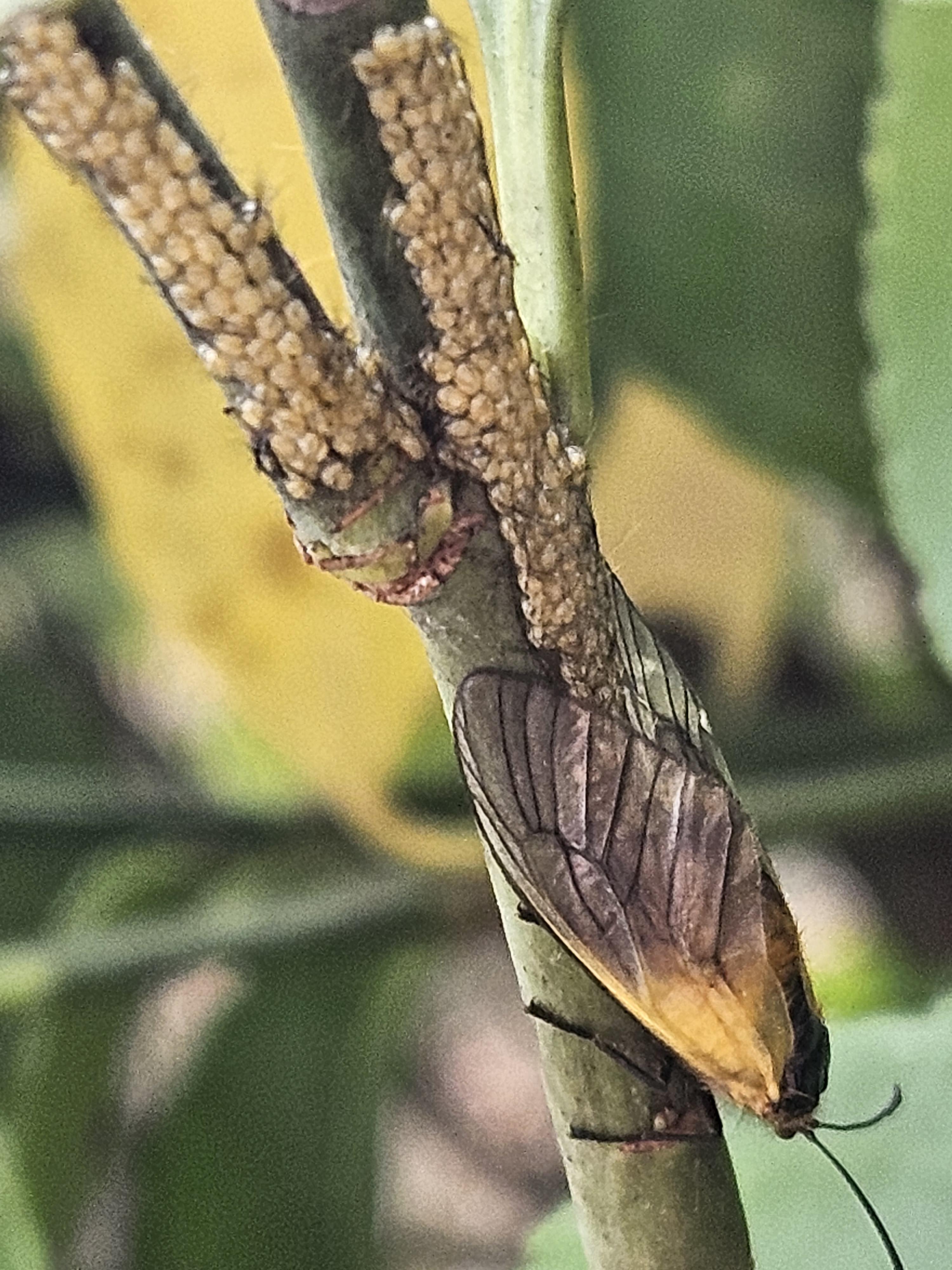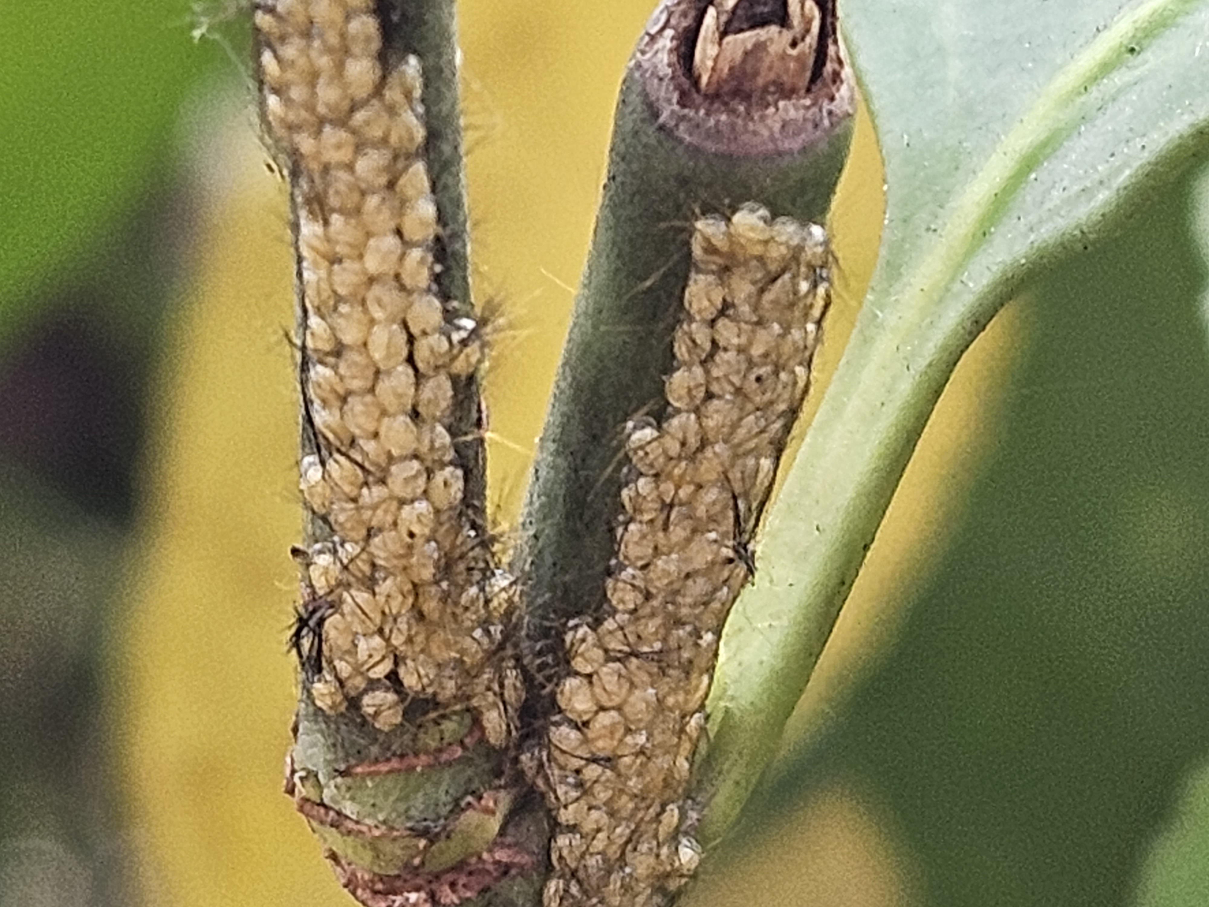 암컷은 사철나무 줄기에서 알무더기로 알을 낳고 있다. 알무더기 표면에는 암컷의 배 끝에 있던 털로 뒤덮여 있다.