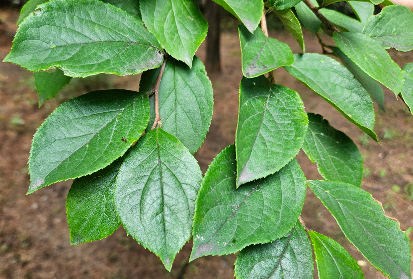 잎: 어긋나기, 긴 타원형이며, 가장자리에 잔톱니가 있다. 잎의 질감은 거칠다.