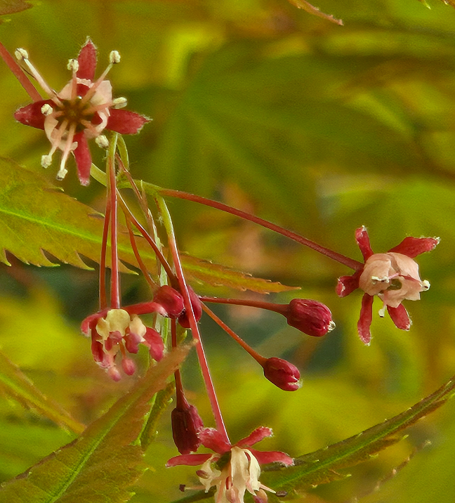 꽃: 꽃은 암수한그루로 잎과 함께 나오는 가지 끝의 고른 꽃차례에 작은 붉은색 꽃이 모여 핀다. 꽃받침 조각과 꽃잎은 각각 5개씩이고 수꽃은 수술이 8개이다.