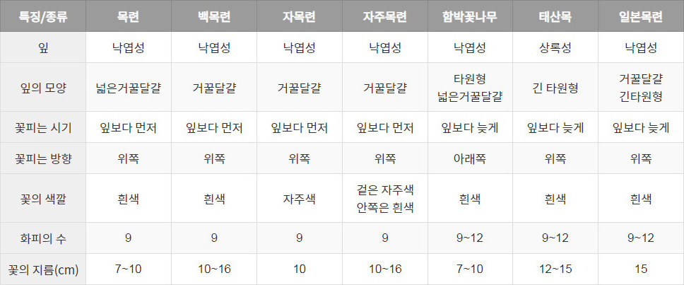 목련의 특징 비교 (일본목련, 함박꽃나무, 자목련, 목련, 백목련)
