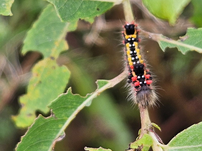 성충의 몸은 회갈색이다. 머리와 가슴 중앙에 연한 붉은 갈색띠가 있다. 앞날개에는 세줄의 회백색 사선이 있고 중앙에는 어두운 갈색이 있다. 노숙유충은 머리는 갈색이며 몸은 어두운 갈색이다. 노숙유충은 특징적인 붉은색·검은색·노란색 돌기가 있는데, 2·3번째 가슴마디와 2번째 배마디의 등에는 2개씩 붉은색의 돌기가 있고, 9번째 배마디의 등에는 6개의 붉은 돌기와 2개의 하얀 점이 있으며, 3~7번째 배마디의 등에는 노란색 돌기가 있다. 번데기는 진한 붉은 갈색으로 황백색인 고치 속에 들어 있고 크기는 15mm쯤이다.