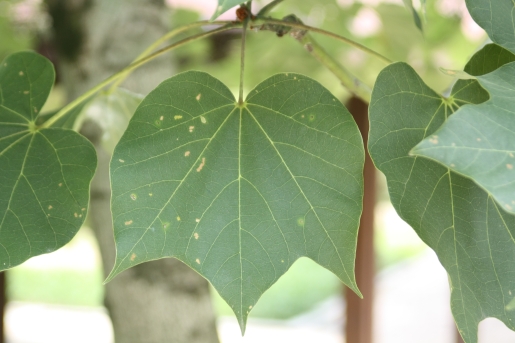 잎: 어긋나기, 갈래잎이며, 윗부분이 3~5갈래로 갈라진다. 오동나무 잎과 비슷하다. 끝은 뾰족하고 밑부분은 심장형이며, 가장자리가 밋밋하다. 양면에 털이 없다.