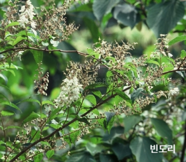 꽃: 양성화, 5~7월에 가지 끝의 원추꽃차례에서 흰색 꽃이 모여 핀다.