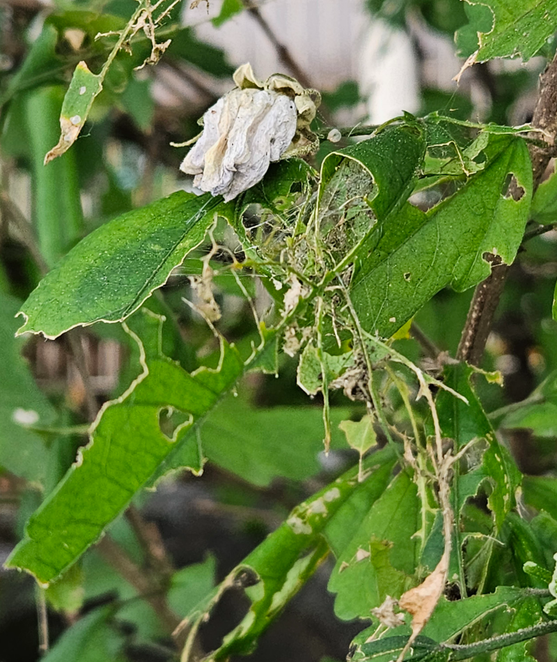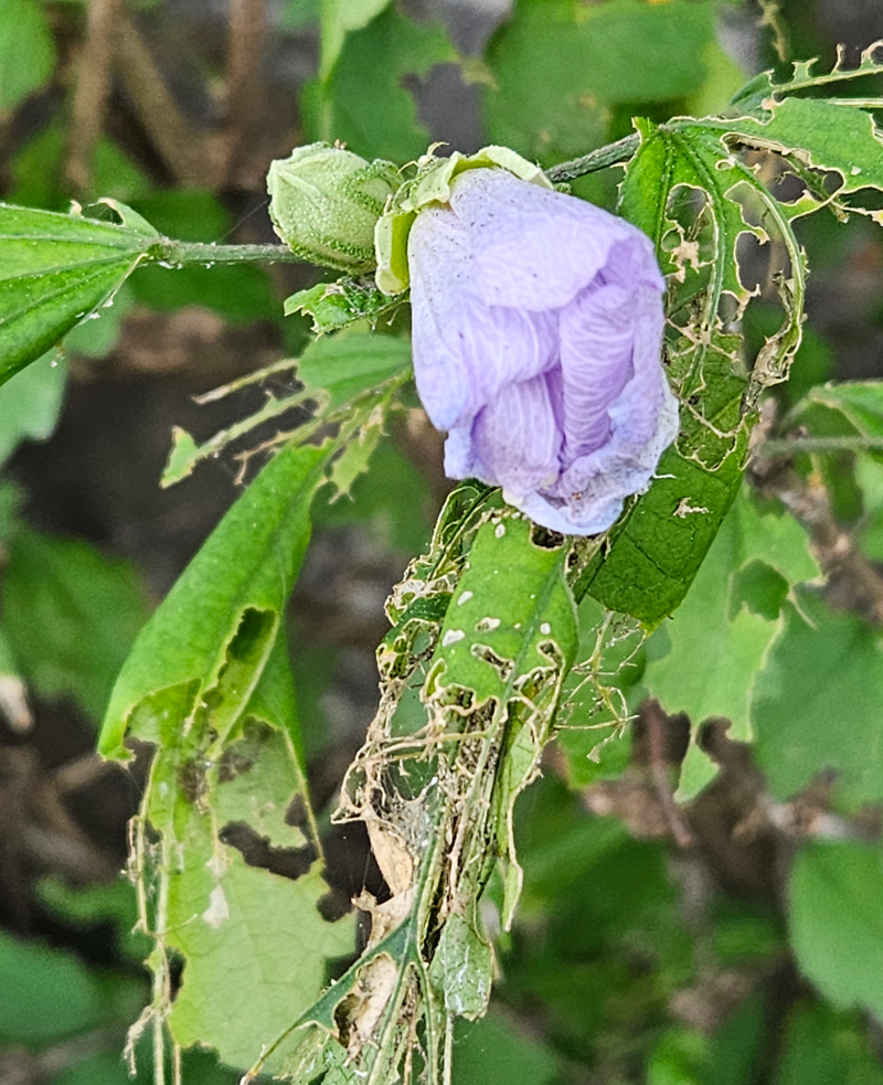 유충이 무궁화 잎을 주맥만 남기고 식해한다.