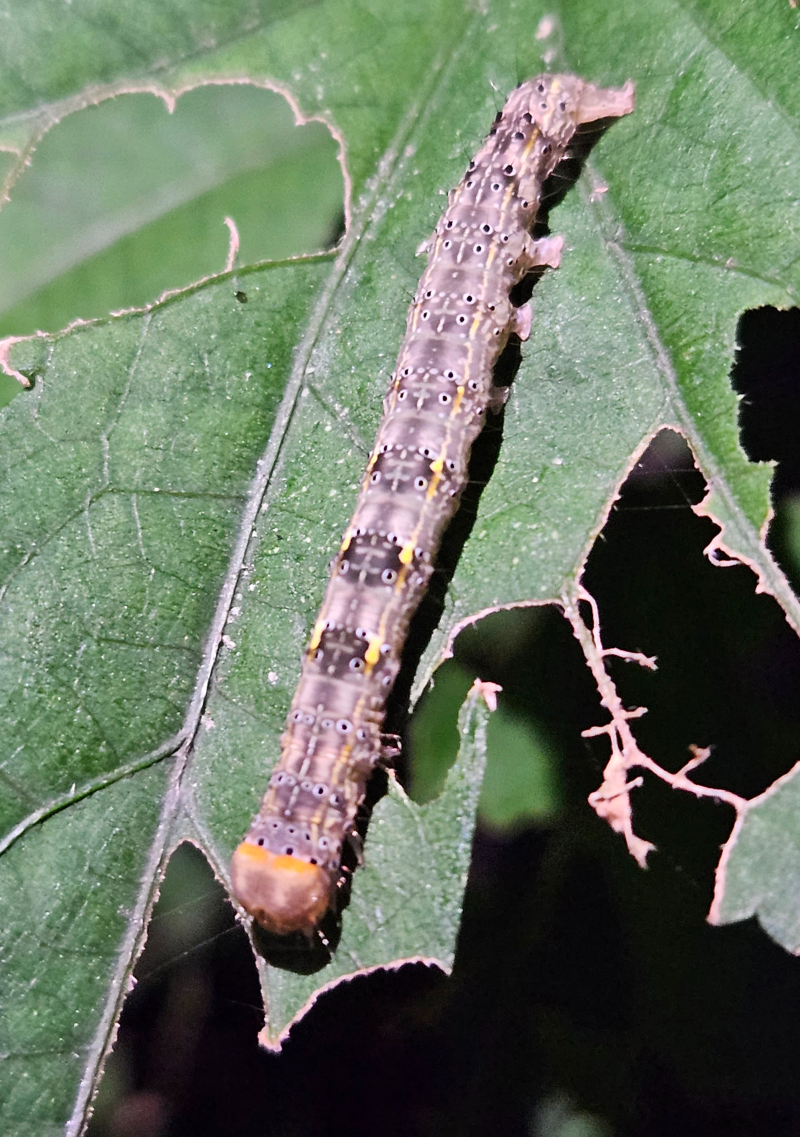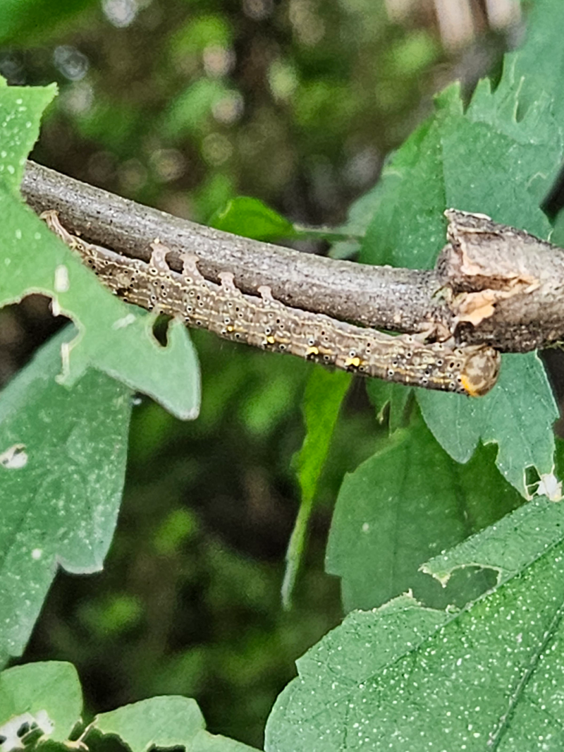 유충은 자나방과 비슷한 모습으로 기어 다니며 노숙유충의 경우 가지에 붙어 있으면 수피 색깔과 비슷하여 눈에 잘 띄지 않는다.