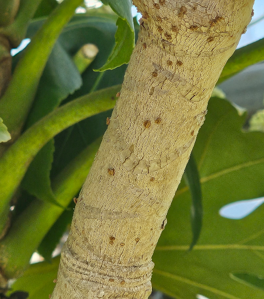 수피: 어린 줄기는 초록색이고 커가면서 잿빛을 띤 회색으로 변한다. 가지에 큰 잎자국이 남아 있다.