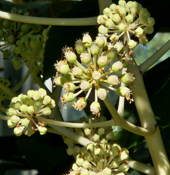 꽃: 수꽃양성화한그루, 11~12월에 가지 끝에서 나온 구형의 산형꽃차례에 백색의 꽃이 모여 달린다. 산형꽃차례는 원추상으로 달리는데 위쪽의 꽃차례에는 주로 양성화가 핀다. 양성화는 수술기가 지나면 꽃잎과 수술이 떨어진다. 개화 말기가 되면 수꽃차례의 수꽃이 핀다.