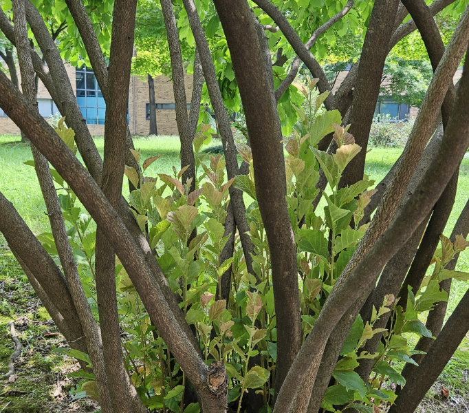 줄기: 밑에서 줄기가 많이 올라와 수형을 이루며 나무껍질은 회갈색으로 매끄럽고 일 년생 가지는 황갈색 또는 암갈색이다.