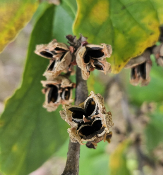 열매: 삭과, 달걀꼴의 구형이며, 갈색으로 익는다. 겉에 짧은 털이 밀생한다. 9월에 익으면 2갈래로 갈라져 2개의 종자가 나온다.