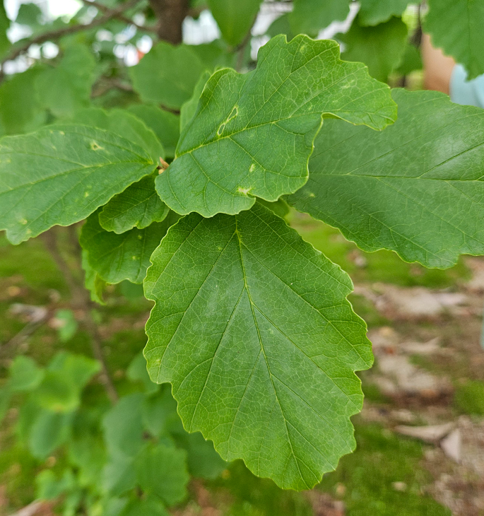잎: 어긋나기, 잎은 약간 찌그러진 마름모꼴이다. 잎 모양은 변화가 많으며 좌우가 비대칭형이다. 끝은 둔하며 밑부분은 얕은 심장형이다. 중앙 이상부의 가장자리에는 물결 모양의 톱니가 있으며 주름이 약간 있다. 측맥은 6~8쌍이다. 잎자루는 길이 5~12mm이고 털이 있다.