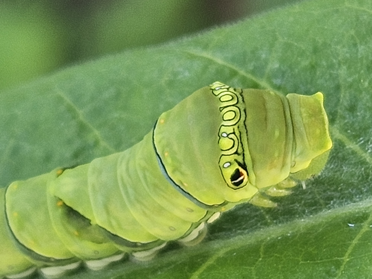 유충의 몸길이는 45∼50mm이며 2∼4령 때는 새똥 같은 모양이다. 5령(종령) 때는 황록색이 되며 주변의 색깔과 비슷한 보호색을 띤다. 배다리 윗부분에 백색무늬가 줄지어 있어서 다른 호랑나비류 유충과 구별된다.